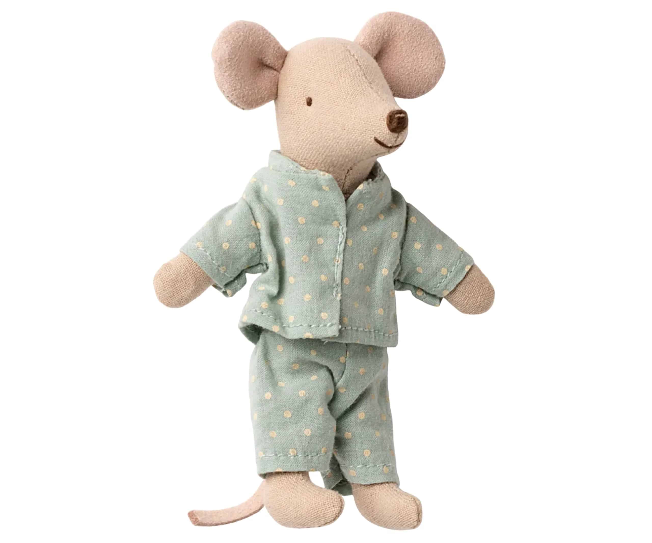 Mooie Little Brother Mouse in Matchbox Blue van Maileg. Dit kleine muisje draagt zachte kleding en slaapt in zijn eigen luciferdoosje met knus beddengoed in prachtige kleuren en lieve prints. Perfect om overal mee naartoe te nemen en heerlijk mee te spelen — overdag avonturen beleven en ’s avonds lekker naar bed!